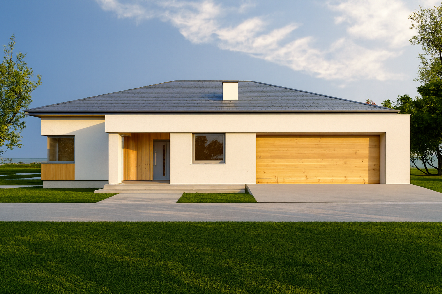 zwarta, parterowa bryła przykryta wielospadowym dachem