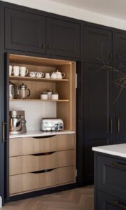 Coraz więcej realizacji idzie w stronę czystego obrazu: zabudowy bez uchwytów, ukryte sprzęty, schowane strefy, ciągłość materiału blatu i backsplashu, mniej wizualnych podziałów.