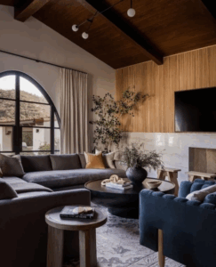 Obłe bryły nadal dominują: łukowe przejścia, zaokrąglone narożniki zabudów, miękkie sofy i stoliki. To trend, który uspokaja przestrzeń i poprawia „flow” we wnętrzu.