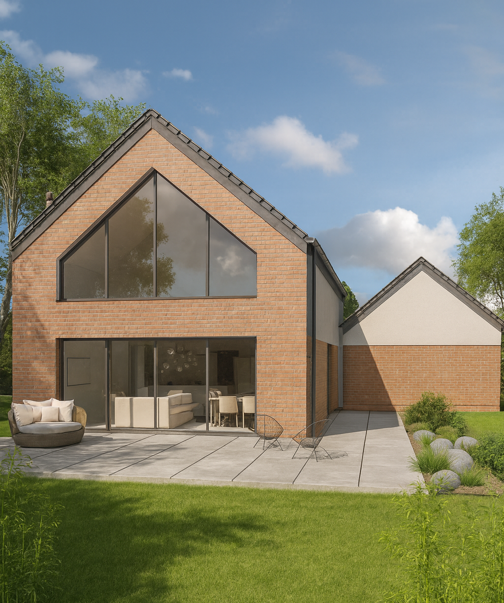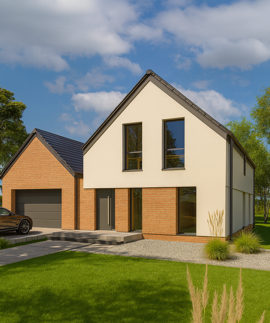 Bryła domu opiera się na prostych, czytelnych formach oraz wyraźnym podziale funkcjonalnym. Połączenie czerwonej cegły klinkierowej, jasnego tynku oraz antracytowej stolarki okiennej nadaje elewacji elegancki i nowoczesny charakter, doskonale wpisujący się w zabudowę jednorodzinną Wielkopolski.