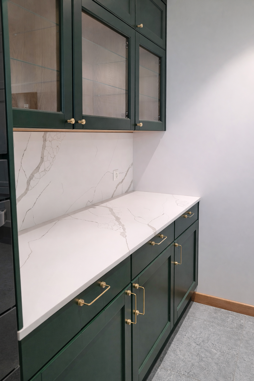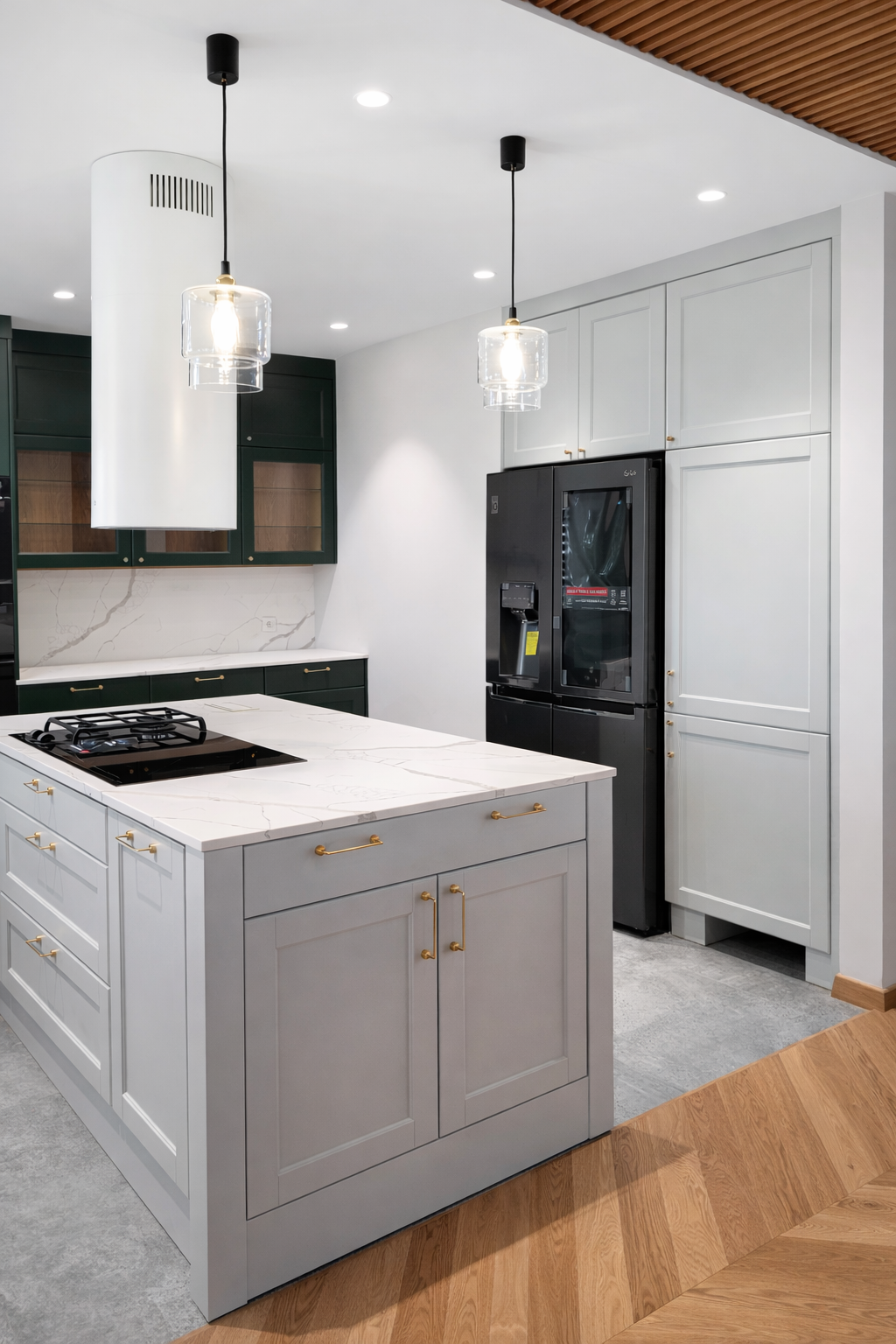 Kuchnia Green to nowoczesny projekt wnętrza, który łączy elegancję z funkcjonalnością. Stonowana zieleń, jasna szarość i marmurowe blaty tworzą spójną, ponadczasową aranżację.