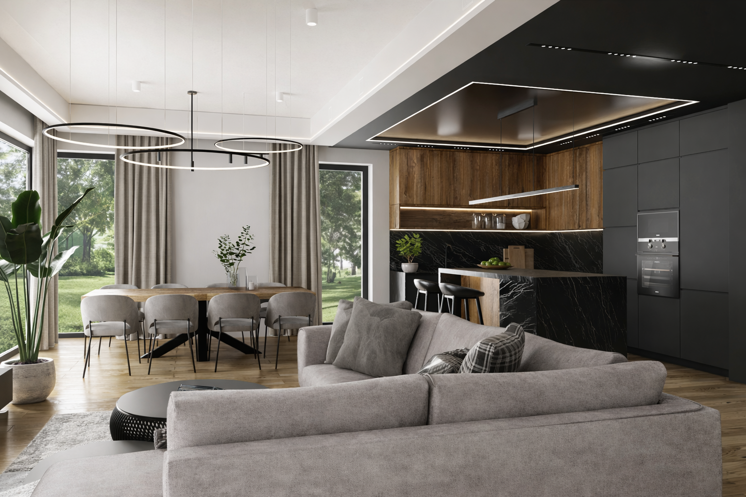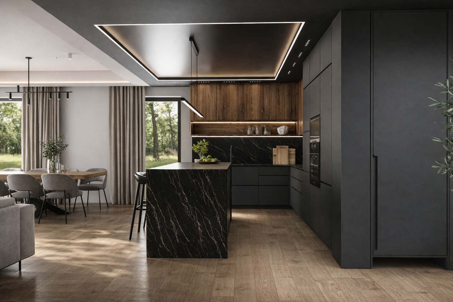 Projekt łączy nowoczesny minimalizm z eleganckimi, luksusowymi akcentami, takimi jak czarny kamień, drewno i designerskie oświetlenie.