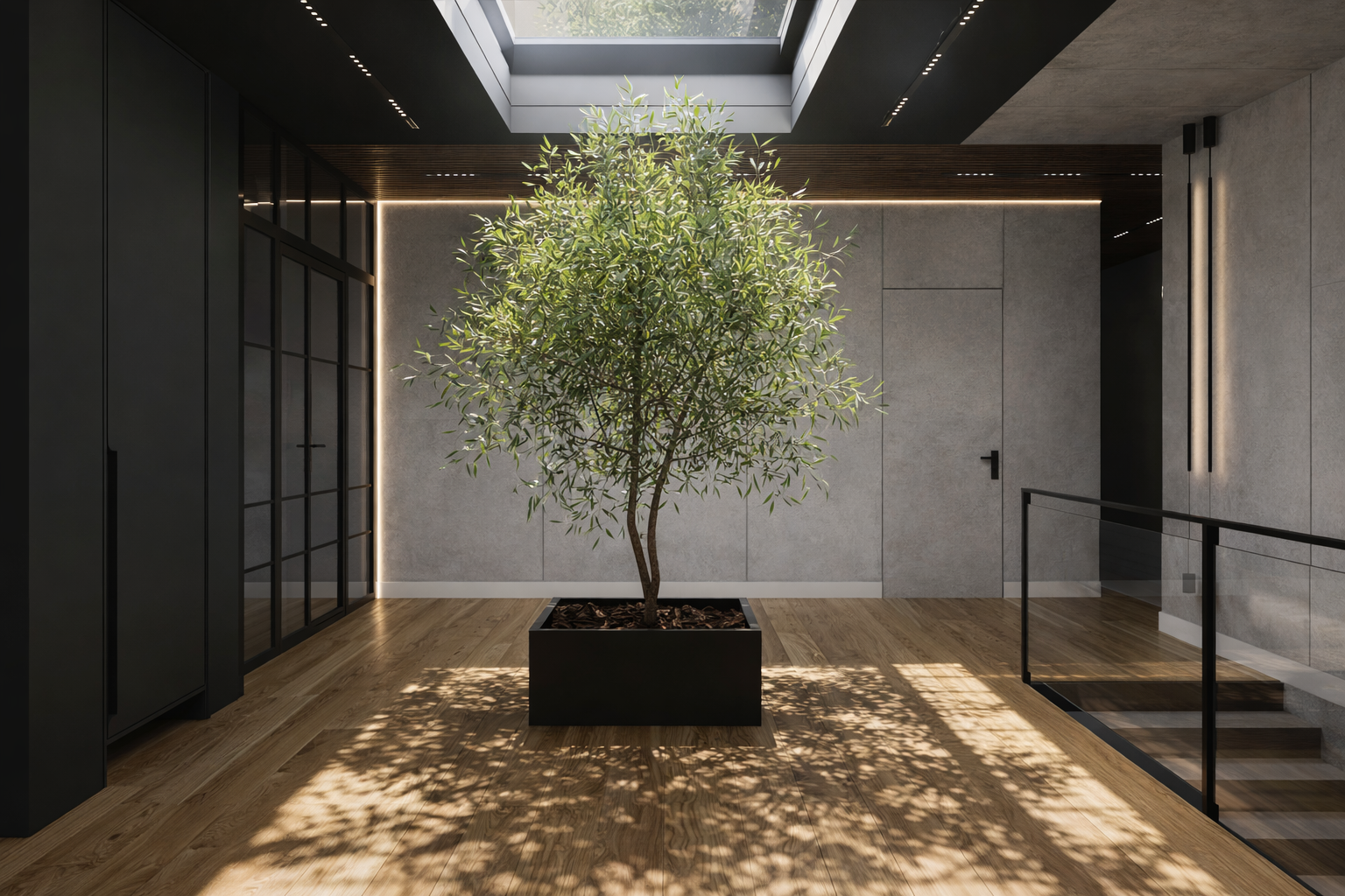 W projekcie mieszkania Nero ważną rolę odgrywają rośliny – zarówno w strefie dziennej, jak i komunikacyjnej. Zielone akcenty ocieplają przestrzeń i wprowadzają element natury, doskonale kontrastując z nowoczesnymi, ciemnymi powierzchniami.