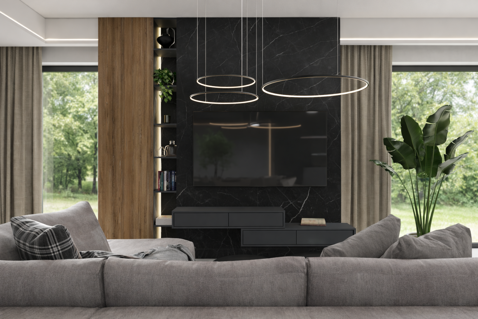 Strefa wypoczynkowa została zaprojektowana jako przestrzeń sprzyjająca relaksowi. Neutralna kolorystyka sof i tekstyliów równoważy ciemne wykończenia, a ściana telewizyjna z czarnego kamienia staje się mocnym, dekoracyjnym akcentem. Duże przeszklenia zapewniają dostęp naturalnego światła i optycznie powiększają wnętrze.