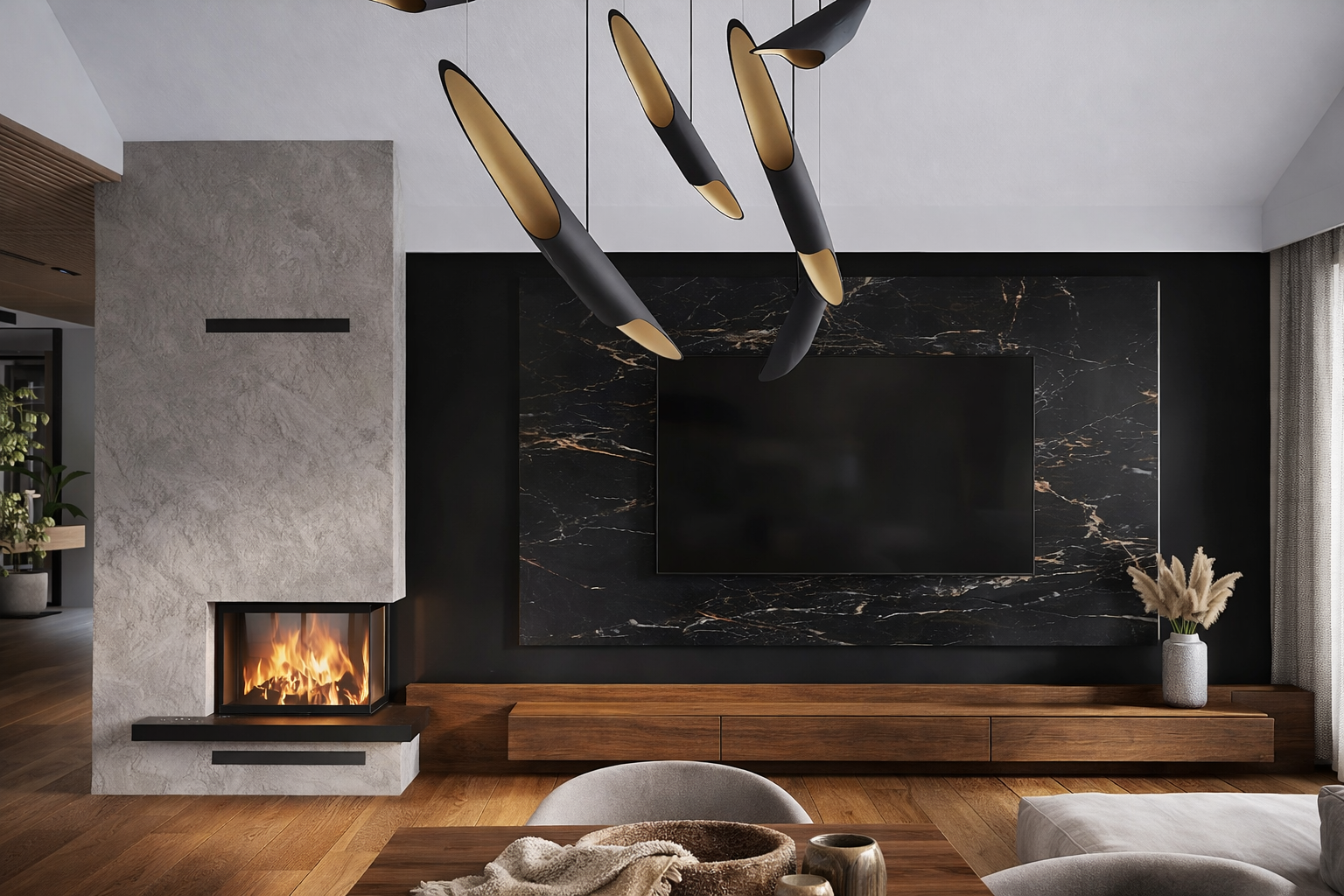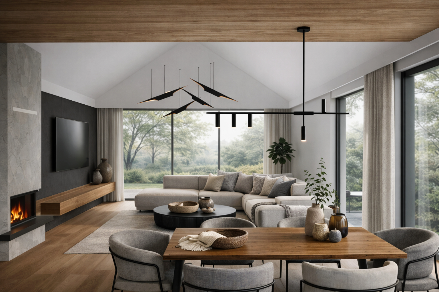 To przestrzeń, w której surowa nowoczesność spotyka się z ciepłem naturalnych materiałów, tworząc wnętrze idealne zarówno do codziennego wypoczynku, jak i eleganckiego przyjmowania gości.
