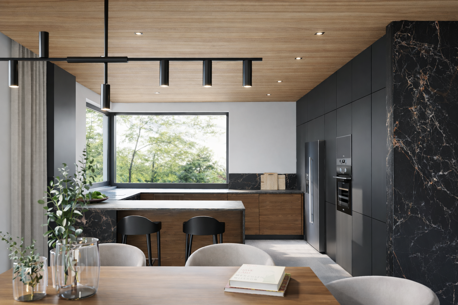 Dominują tu stonowane barwy – szarości, czerń i naturalne drewno – które budują nowoczesny, a jednocześnie przytulny klimat. Kuchnia z ciemną zabudową i wyspą o wyrazistym, marmurowym akcencie stanowi eleganckie tło dla jasnej części wypoczynkowej.