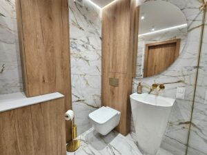 - montaż wyposażenia: WC podwieszane, umywalka wolnostojąca, armatura, szkło prysznicowe,