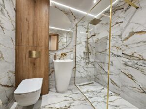 - efekt “hotelowej” łazienki: wielkoformatowe płytki w rysunku marmuru + ciepłe drewno + złota armatura,