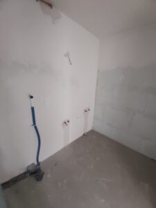 Na etapie “przed” łazienka była w stanie roboczym: widoczne podejścia instalacyjne, niegotowe ściany, brak okładzin, elementy techniczne do zabudowy i przygotowany odpływ. Taki start to częsty scenariusz w apartamentach — i dobra okazja, żeby zrobić układ i instalacje „pod projekt”, a nie odwrotnie.